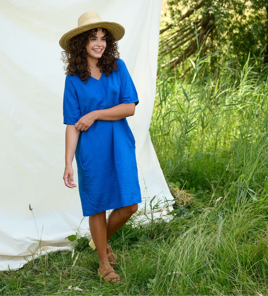 Linde, linnen zomer hit.Ruimvallende jurk met V-hals, korte mouwen en steekzakken in de naad. De jurk valt op de knie. Easy Linnen kwaliteit van FOS biedt een harmonieuze mix van linnen en viscose, waardoor het zowel elegant als zacht aanvoelt. Met 65% linnen en 35% viscose creëert deze stof een subtiel slub-effect dat zorgt voor extra textuur en karakter. Dankzij de natuurlijke soepelheid, ademend vermogen en frisse uitstraling is deze stof ideaal voor onze zomerjurkjes!