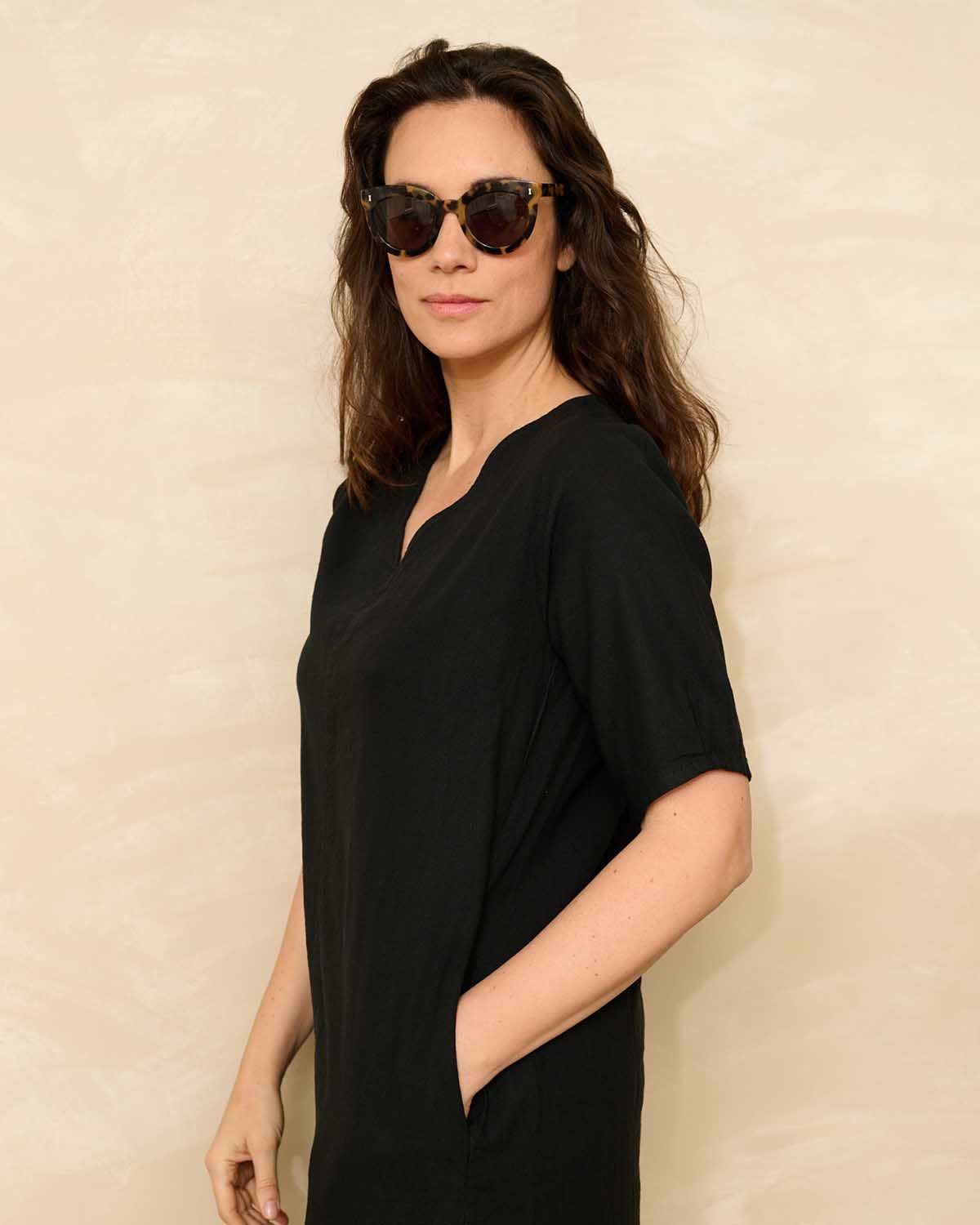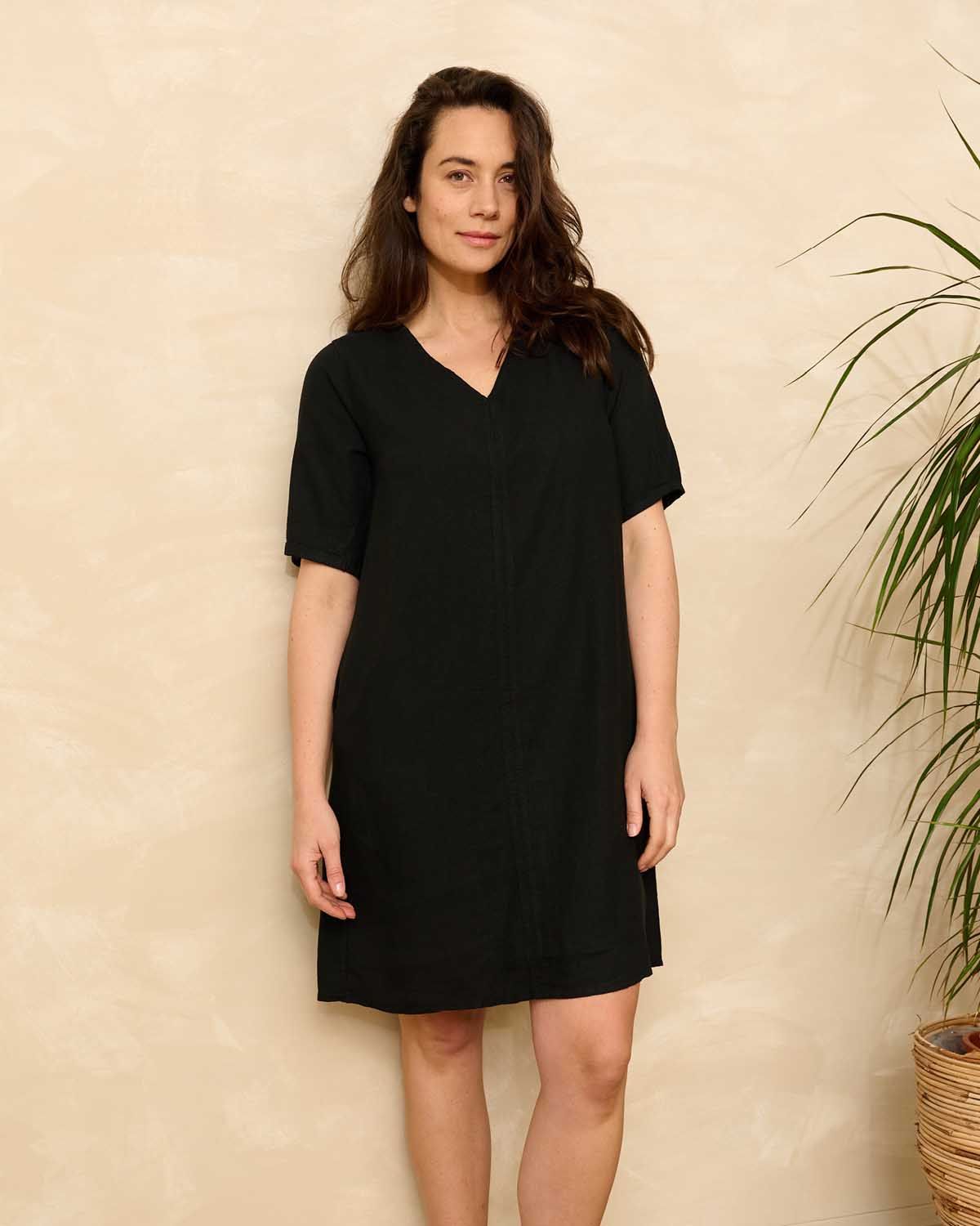 Linde, linnen zomer hit.Ruimvallende jurk met V-hals, korte mouwen en steekzakken in de naad. De jurk valt op de knie. Easy Linnen kwaliteit van FOS biedt een harmonieuze mix van linnen en viscose, waardoor het zowel elegant als zacht aanvoelt. Met 65% linnen en 35% viscose creëert deze stof een subtiel slub-effect dat zorgt voor extra textuur en karakter. Dankzij de natuurlijke soepelheid, ademend vermogen en frisse uitstraling is deze stof ideaal voor onze zomerjurkjes!