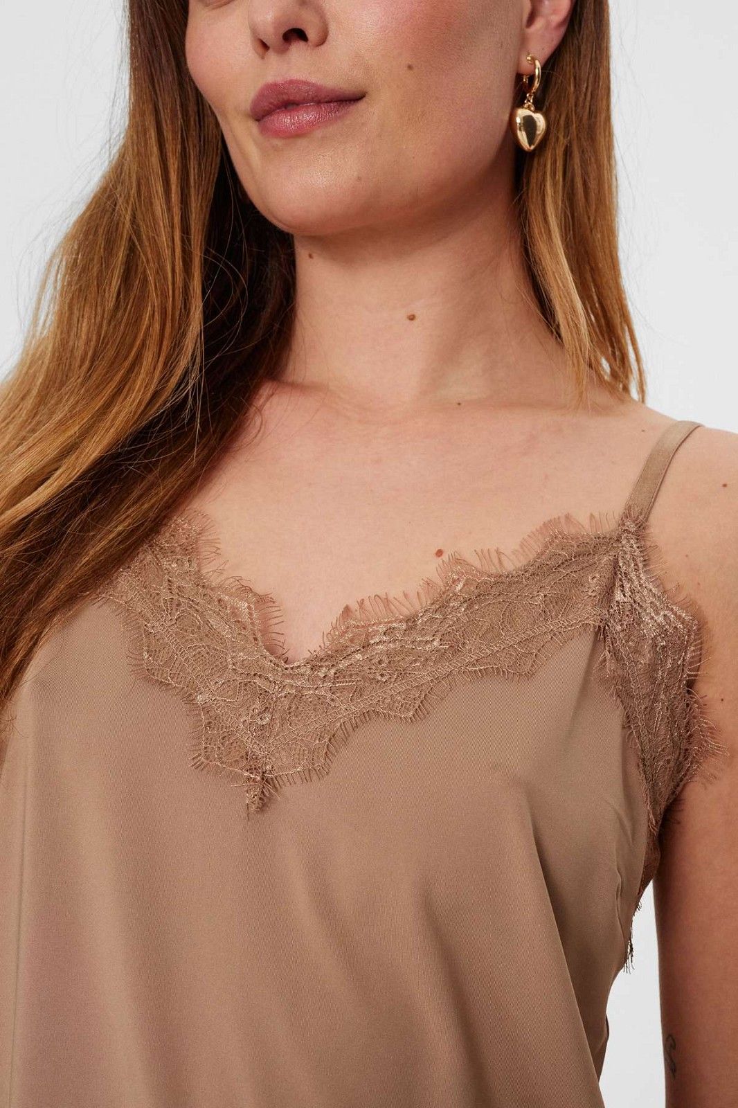 Schattige kanten top met bandjes van Freequent, in glanzend materiaal en kanten rand aan de boven- en onderkant. De perfecte top die past bij alles, onder een jasje/vestje of gewoon met een rok of spijkerbroek!